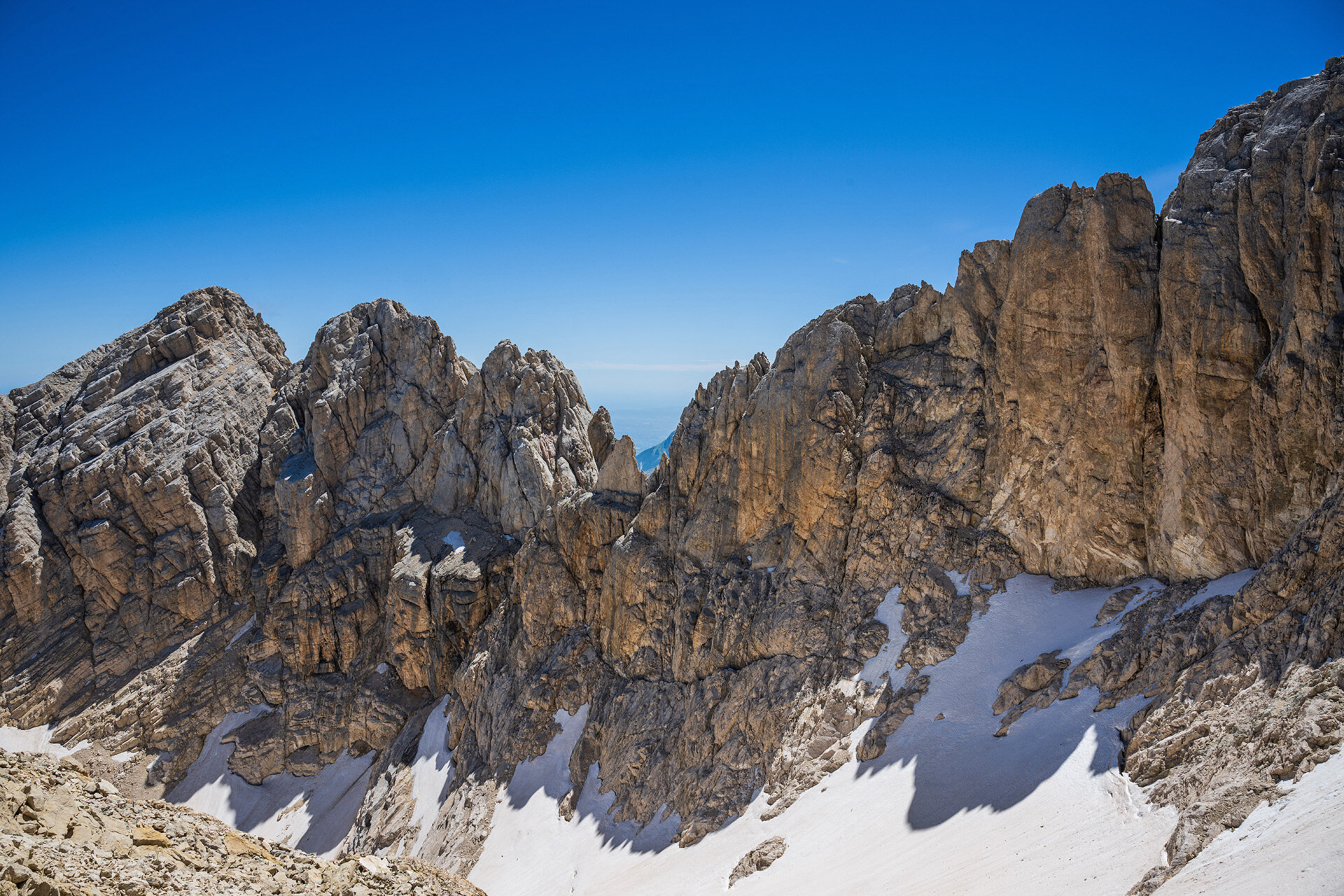 L’escursione che da Campo Imperatore conduce sul Corno Grande, la vetta più alta degli Appennini, sintetizza il carattere di questa regione, dura e generosa allo stesso tempo.