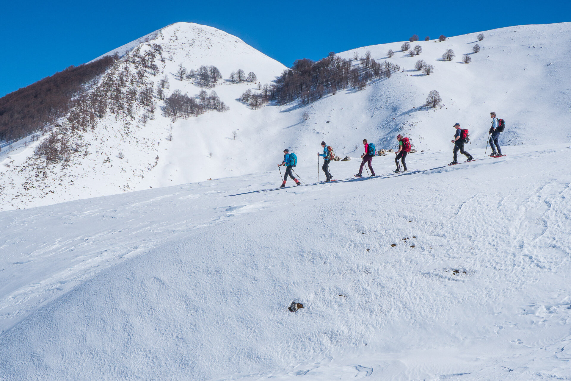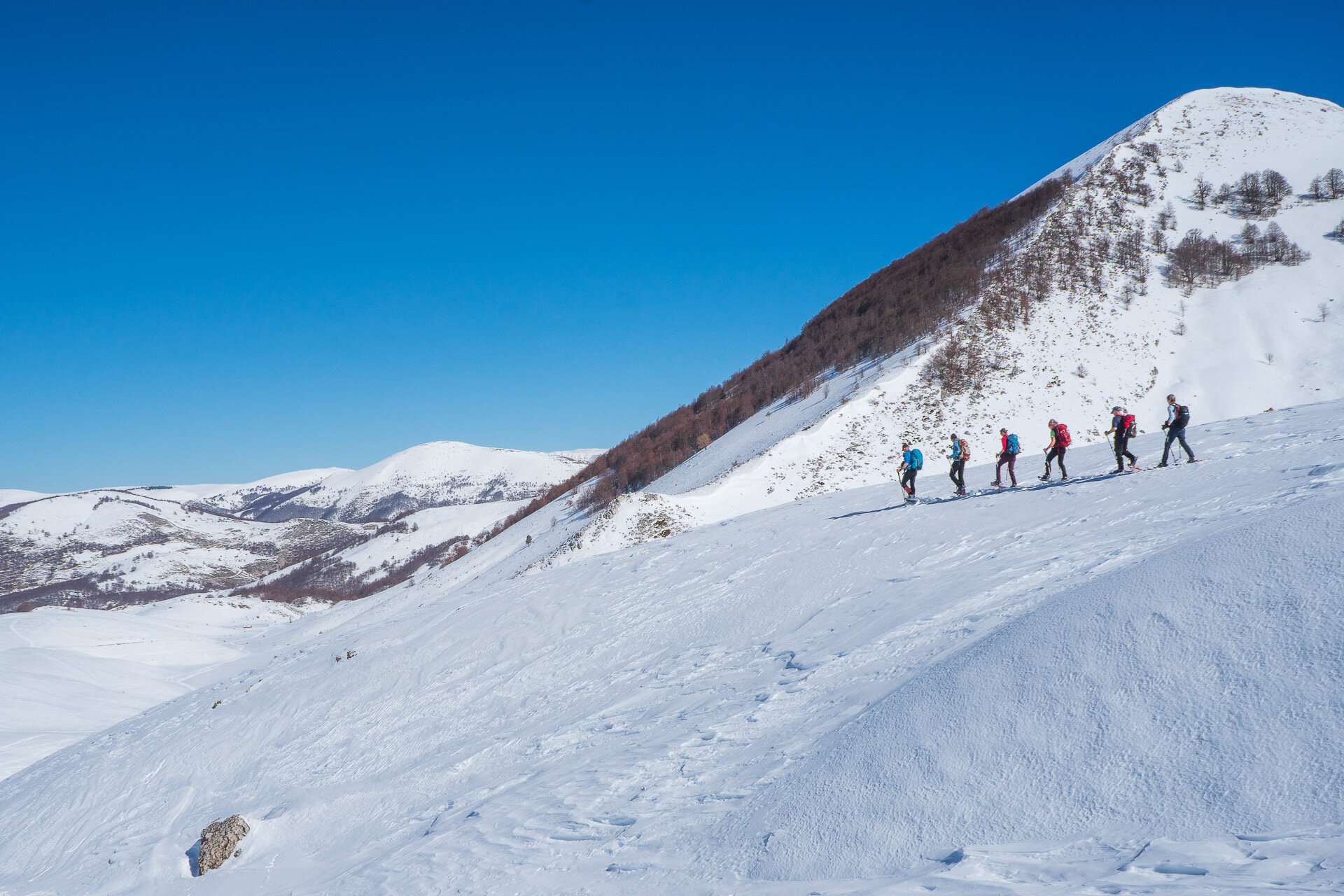 La Valle di Ziomas ci accoglie con un paesaggio invernale sereno, dove pendii e doline carsiche sono ammorbiditi dal manto nevoso.I disegni lasciati dal vento e le tracce di lupi e volpi ci guidano come in un racconto affascinante. Dalla sella che si apre sul Ferroio di Scanno, lo sguardo si perde nella bellezza del paesaggio.